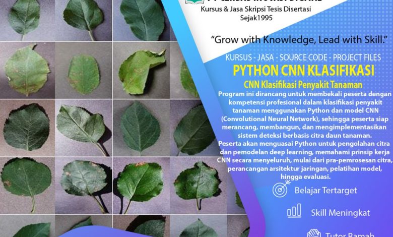 Program ini dirancang praktis, hands-on, dan berbasis studi kasus proyek nyata — bukan hanya teori, tetapi langsung membangun sistem klasifikasi penyakit tanaman siap portofolio seperti yang digunakan dalam riset akademik, pengembangan sistem pertanian cerdas, eksperimen machine learning, dan kebutuhan tugas akhir berbasis data citra tanaman modern.